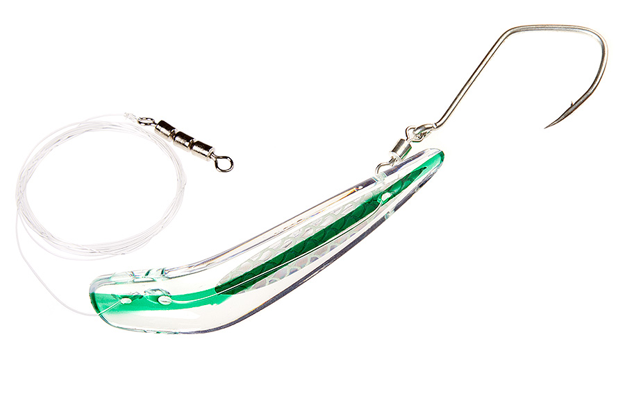 Блесна оснащена специальным монофильным поводком диаметром 0,52мм, крючком в размере #7/0 в сочетании с вертлюгом #2, а также трехсоставным высокоскоростным вертлюгом #3 для крепеления к флешеру.