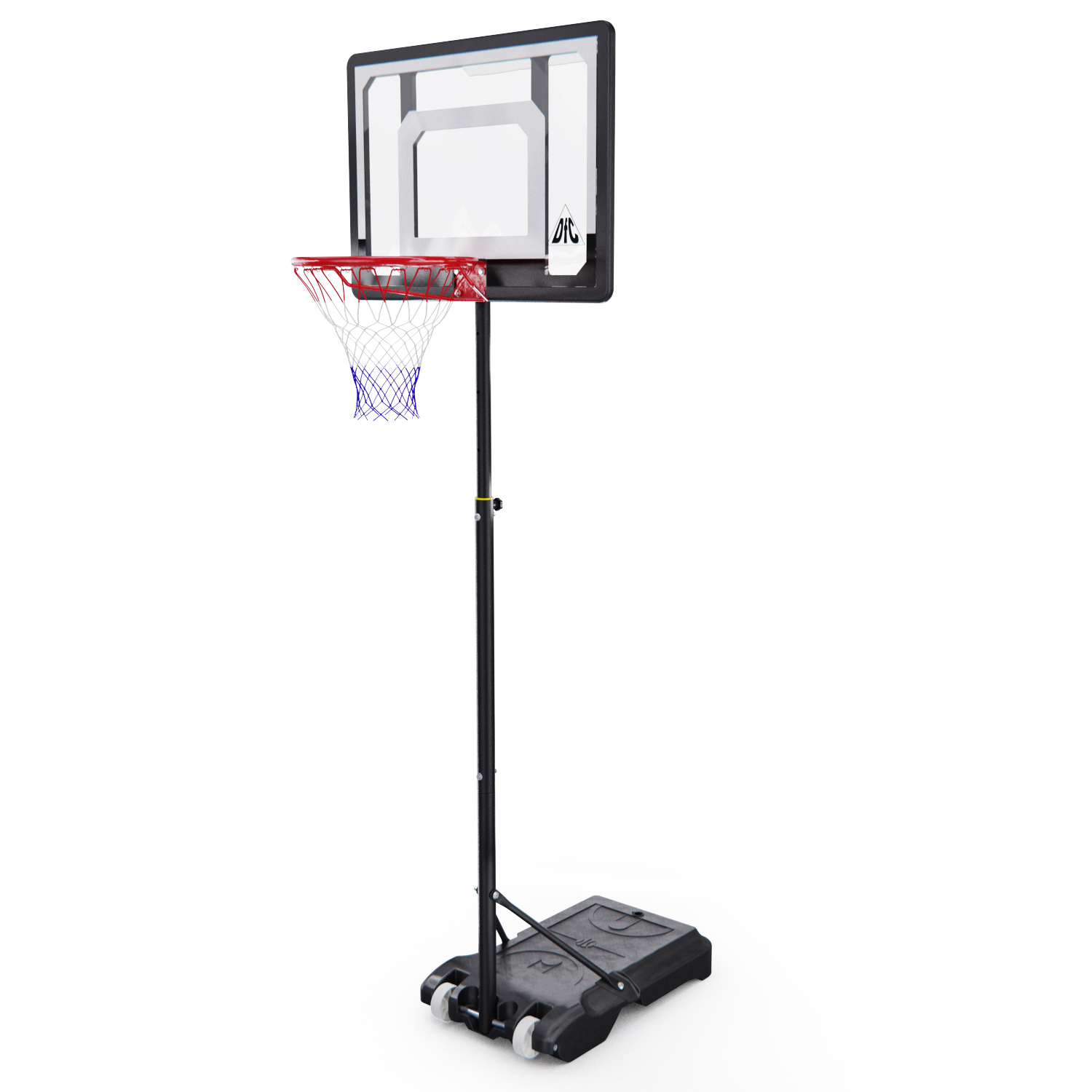 Телескопическая регулировка высоты от 165 до 210 см (по кольцу). Детская мобильная баскетбольная стойка. В основание необходимо залить воду или засыпать песок.