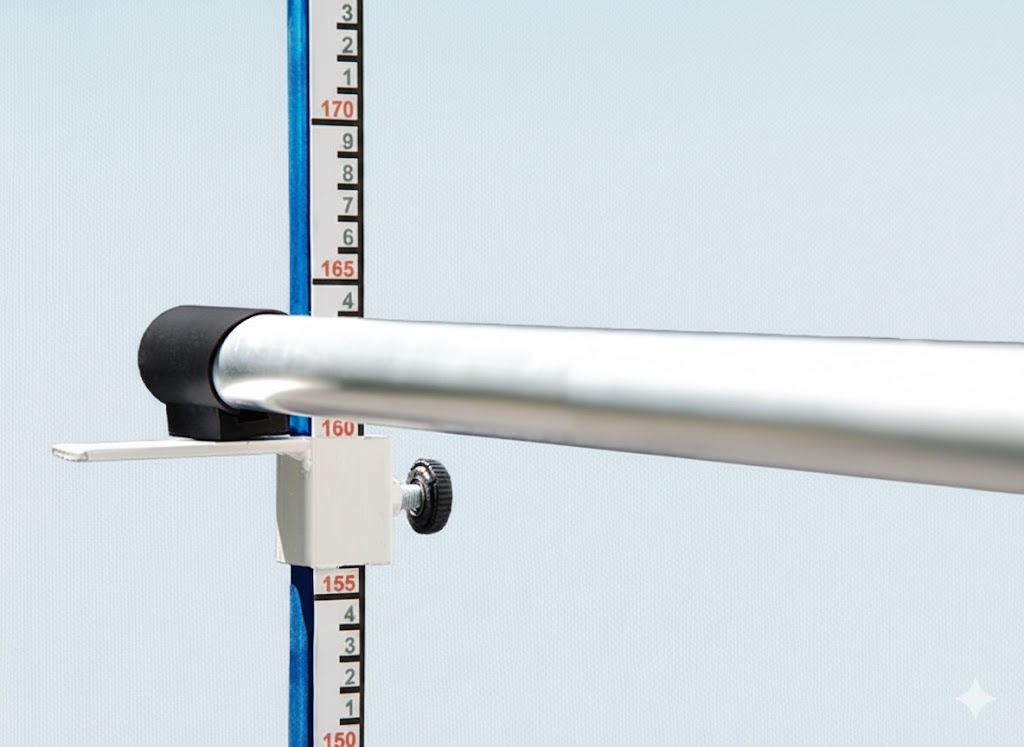Высота стоек 2,2 м. Полки для планки регулируются и фиксируются на нужной высоте винтом-барашком. На стойки нанесена разметка.