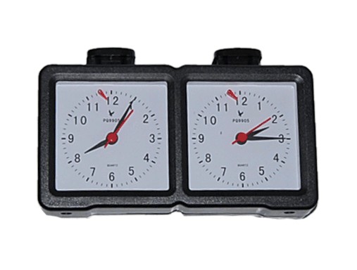 Часы включают в себя – два циферблата, две пластиковые кнопки для переключения часов. На каждом циферблате имеется флажок для фиксации окончания времени. С оборотной стороны находятся два поворотных механизма перевода стрелок для регулировки часовой и минутной стрелки.