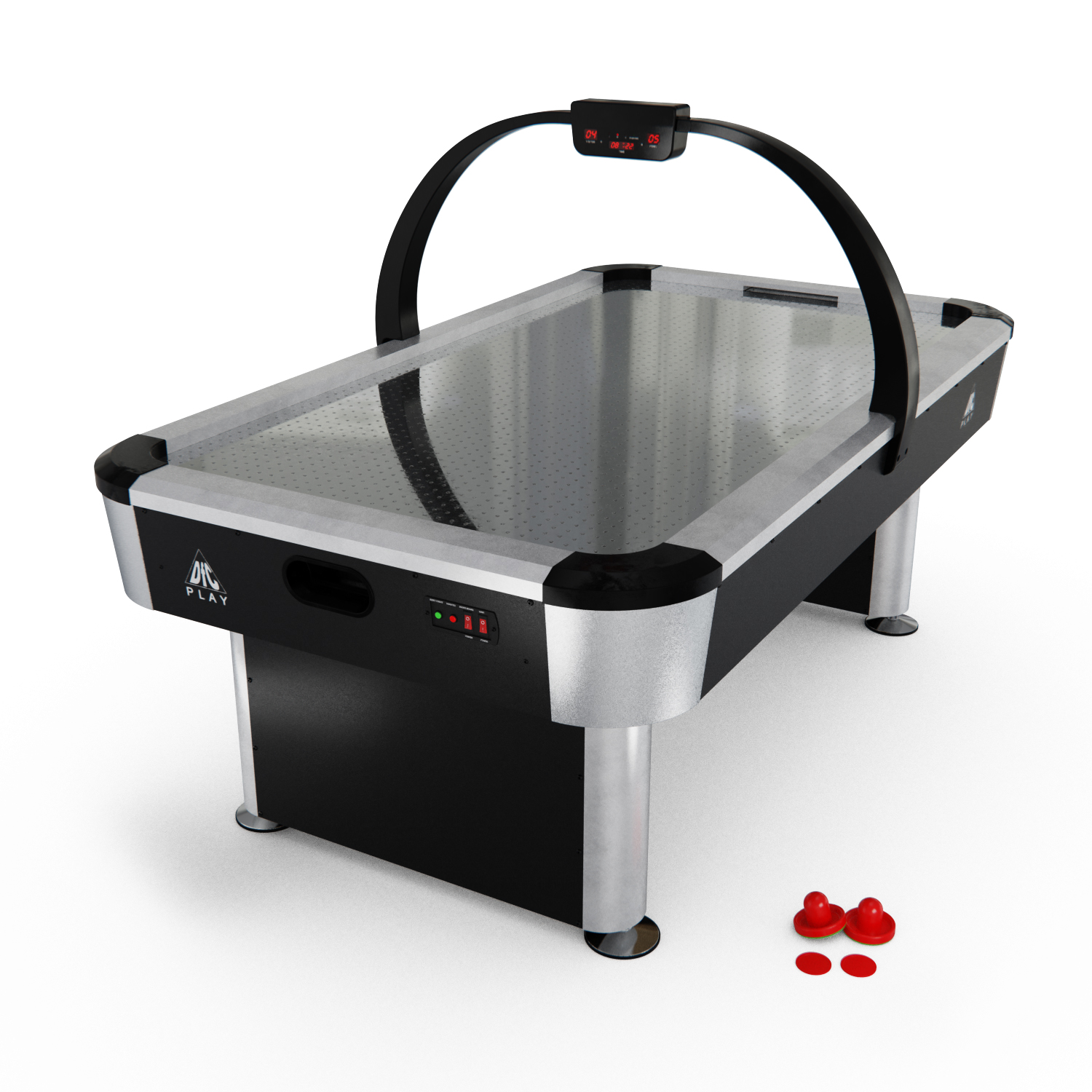 Кроме того, в комплекте со столом вы найдете четыре красных биты 96 мм и четыре красных шайбы 63 мм для незабываемой игры. Счётчик располагается дугой над игровым полем на высоте 54 см по нижнему краю и 66 см по верхнему, благодаря чему, игроки могут следить за счётом, не отрываясь от игры. Он работает на трех батарейках типа ААА, не входят в комплект.