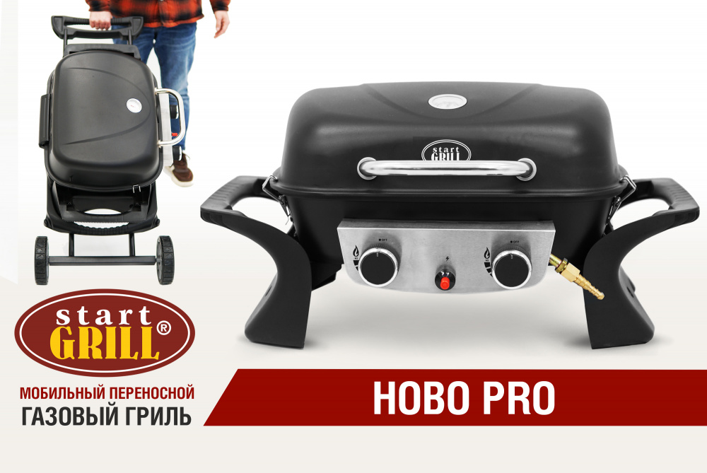 Преимущества HOBO PRO включают две горелки для более мощного и равномерного нагрева, встроенный термометр для контроля процесса готовки, а также пьезоподжиг для удобного разжигания. Гриль работает от стационарного газового баллона с российским соединением, и в комплекте поставляются шланг и регулятор.