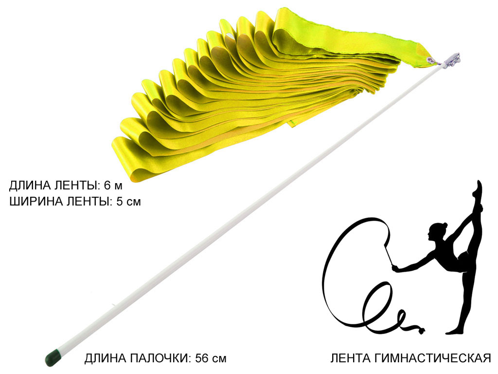 опытным гимнасткам. Палочка белого цвета, конической формы, оснащена карабином, на который крепится сама лента. Длина ленты 6 метров, цвета ленты в ассортименте.