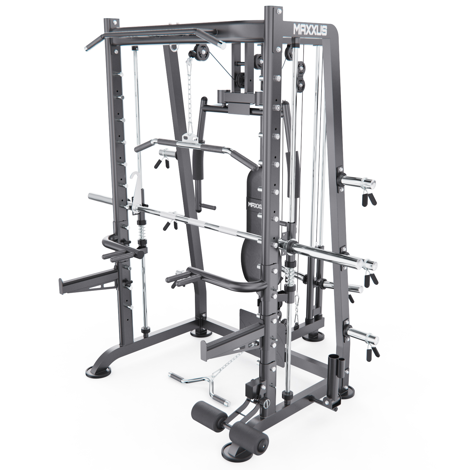 Машина Смита MAXXUS GSMX-600019 — полноценная замена спортзалу у вас дома! Она сочетает в себе машину Смита, силовую станцию, мультипозиционный турник и функциональную раму, позволяя прорабатывать все группы мышц в одном комплексе.