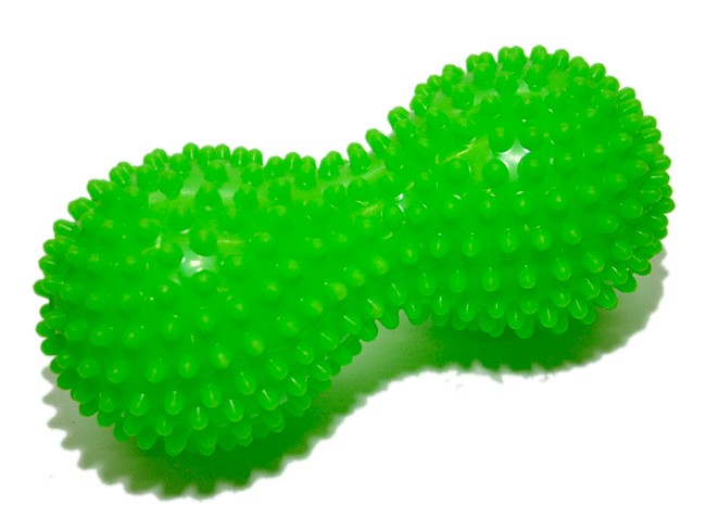 Массажный мяч двойной применяется при восстановлении после травм рук, профилактики плоскостопия. При занятиях с данным мячиком шипы на поверхности воздействуют на нервные окончания, улучшается приток крови, стимулируется кровообращение.