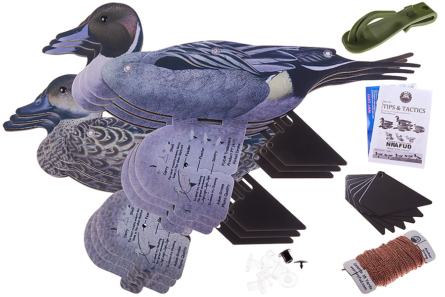 Набор муляжей утки породы Шилохвость состоит из 6 складных, полноразмерных, трехмерных чучел с фотореалистической окраской, выполненной по технологии "BIRD VISION" – окрас чучела ничем не отличается от окраса живых птиц, он не бликует на солнце и отражает ультрафиолетовое излучение так же, как и настоящие перья птицы. Для переноски и хранения, чучело складывается, становится плоским и занимает минимальный объем. В рабочее состояние чучела приводятся буквально за несколько секунд - эту операцию можно делать в условиях недостаточного освещения, сильного ветра, замерзшими руками и т.д. После установке чучелу можно придать различные позы (сторожевые, отдыхающие и т.д.) – тем самым сформировать стаю, исходя из конкретных условий охоты. Чучела можно устанавливать как на воду, так и на землю. В отличие от других чучел, нога (киль) чучела выполнена из стали и ее можно вбивать даже в мерзлую землю. Чучела практически невозможно сломать, они выдерживают заряд дроби.