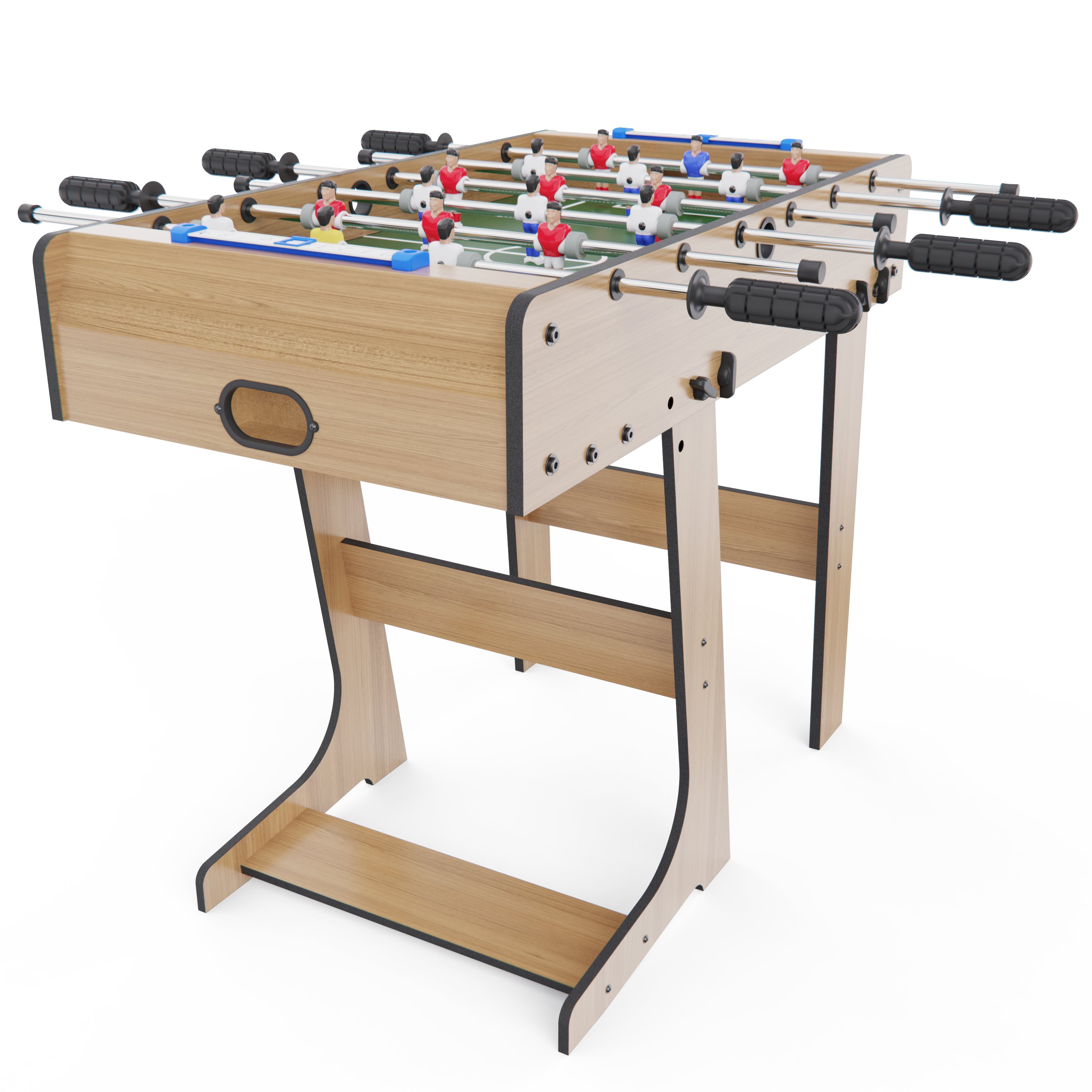 Высота ножек 60,5 см обеспечивает удобное расположение стола в помещении. Складная модель позволяет быстро сложить кикер после игры и убрать его на хранение, что особенно удобно для домашнего формата. В комплект входят 2 футбольных мяча, поэтому можно начинать игру сразу после сборки.