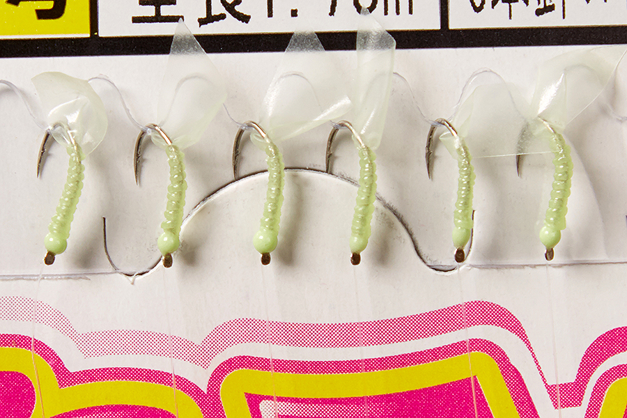 Монтаж выполнен с применением светонакопительного мобискина и крючков Doutsuki Koaji с никелированным покрытием и зелеными светонакопительными головками.