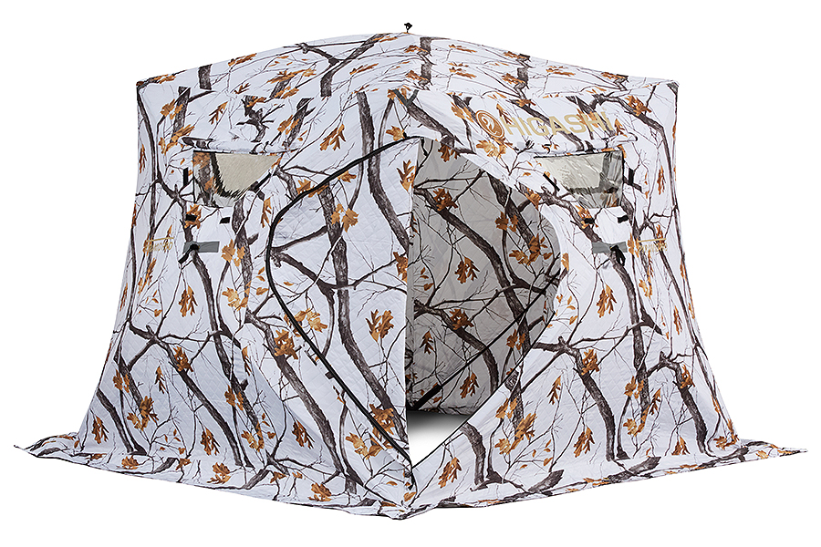 Утепленная трапециевидная зимняя палатка. Выполнена в зимнем камуфляже.