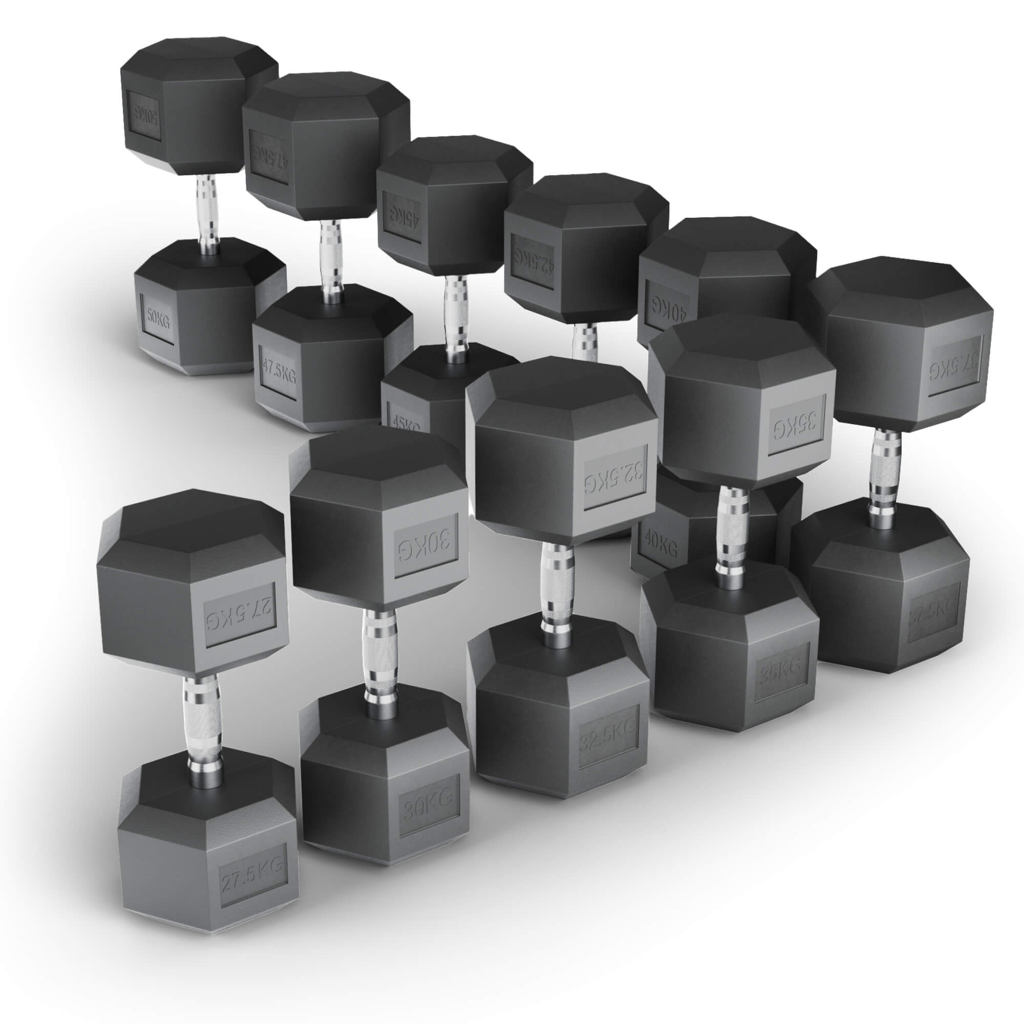 Набор обрезиненных гантелей включает в себя веса 27,5 кг, 30 кг, 32,5 кг, 35 кг, 37,5 кг, 40 кг, 42,5 кг, 45 кг, 47,5, 50 кг, что позволит вам выбирать оптимальную нагрузку для каждого упражнения. Не упустите возможность вывести свои тренировки на новый уровень!