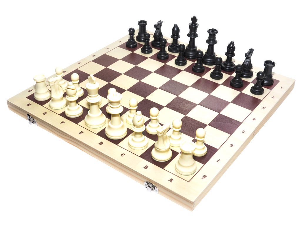 Комплект состоит из пластиковых шахматных фигур и деревянной доски.
