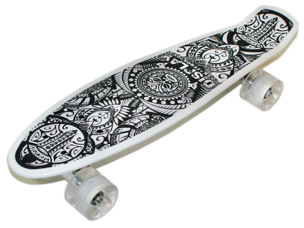 Скейт с наждачной декой обеспечивает отличное сцепление во время катания. Дека загнута только с одной стороны, хвостовой части. На нем можно с удобством кататься по улицам города. Скейт имеет удобные габариты, что позволяет пристегивать его к рюкзаку специальными ремнями или носить в чехле. Колеса на скейте светятся при вращении. Широкие PVC колеса обеспечивают приятное и комфортное катание. Отличный накат доске придают подшипники ABEC-7. Демпфирующая прокладка между декой и подвеской прекрасно гасит вибрацию во время катания. На деку нанесен рисунок, придающий стильный вид.