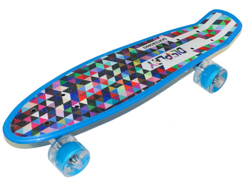 Скейт с наждачной декой обеспечивает отличное сцепление во время катания. Дека загнута только с одной стороны, хвостовой части. На нем можно с удобством кататься по улицам города. Скейт имеет удобные габариты, что позволяет пристегивать его к рюкзаку специальными ремнями или носить в чехле. Колеса на скейте светятся при вращении. Широкие PVC колеса обеспечивают приятное и комфортное катание. Отличный накат доске придают подшипники ABEC-7. Демпфирующая прокладка между декой и подвеской прекрасно гасит вибрацию во время катания. На деку нанесен рисунок, придающий стильный вид.