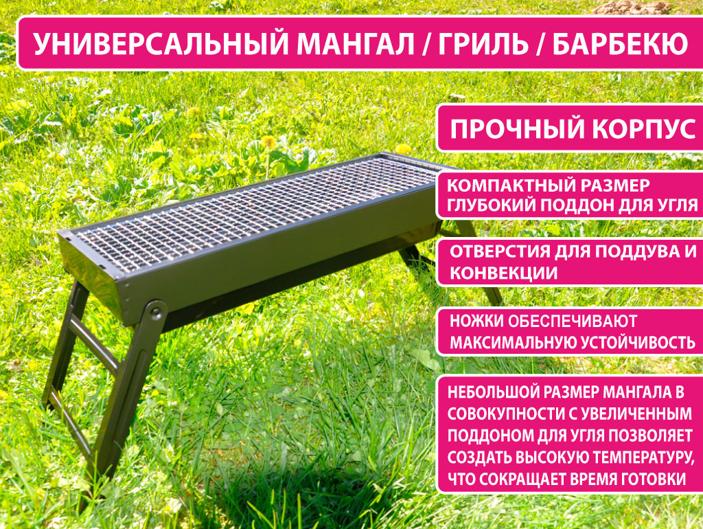 Мясо и овощи на углях — классическое и любимое угощение во время отдыха на природе. Портативный мангал быстро и легко раскладывается, не занимает много места во время хранения. С ним, вам не нужно будет разводить костёр, искать место с держателями для шампуров. Простая конструкция станет для вас универсальным помощником в походе. Такой мангал по типу угольного гриля оценит каждый. В комплектации имеются две сетки. Одна сетка для угля и вторая для приготовления еды. Мангал имеет ножки и не соприкасается с землей, что в свою очередь позволяет его использовать в любое время года, вне зависимости от погодных условий.